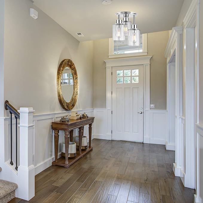 Semi Flush Mount Ceiling Light, 3-Light Close to Ceiling Light Fixtures, Electroplating Chrome Finish with Clear Seeded Glass Shade Chandelier Lighting for Stairs Porch Hallway Entryway Kitchen