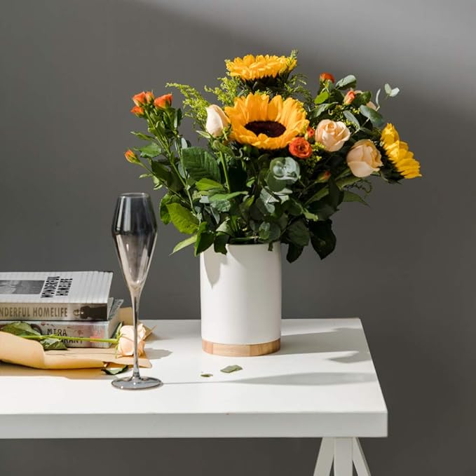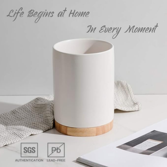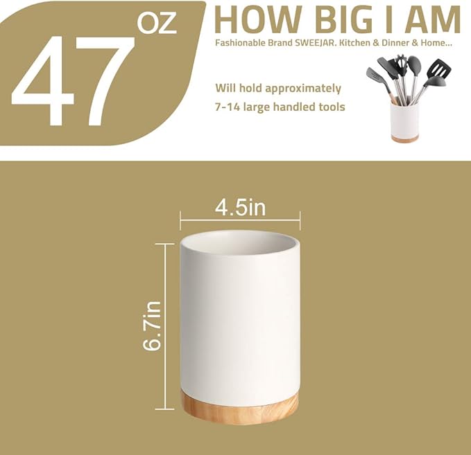 Sweejar Kitchen Utensil Holder with Wooden Bottom, 6.7" Ceramic Utensil Crock to Hold Spatulas for Cooking Countertop, Housewarming, Wedding, Birthday Gift (White)