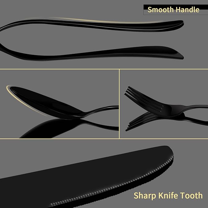 - The long handles of the black cutlery, with proper gauge thickness and weight to achieve better grip for adults and older children
