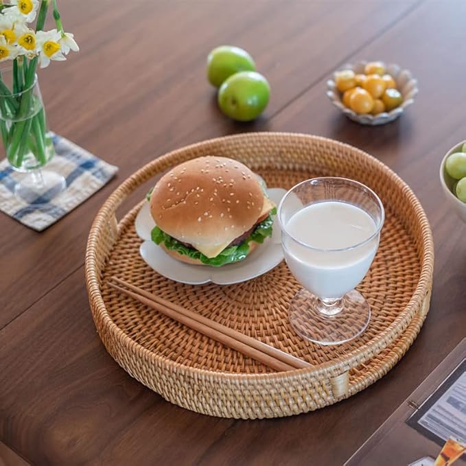 YANGQIHOME Rattan Round Serving Tray, Decorative Coffee Table Tray, Hand Woven Serving Basket with Handles, Ottoman Wicker Fruit/Bread Serving Basket, 13.8 inch
