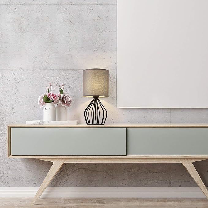 HAITRAL Farmhouse Table Lamp - Small Nightstand Lamp for Bedroom, Black Metal Cage Table Lamp for Living Room, Dorm, Office with Hollowed Out Base, Gray