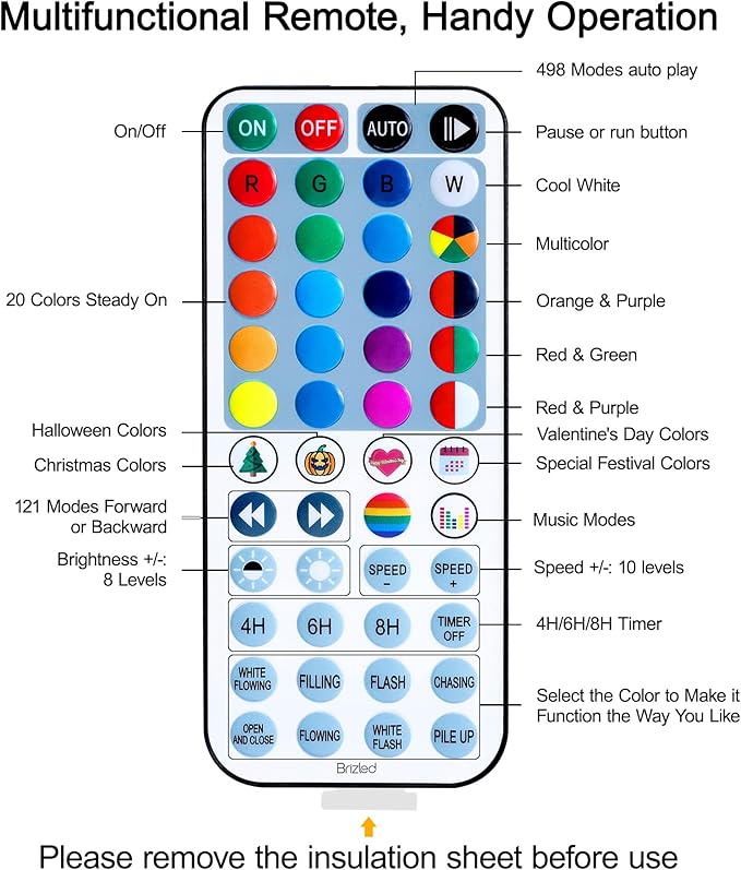 - Why These String Lights Would Be Your Best Choice: Compared with other RGB string lights, Brizled 48-key remote multifunctional LED string lights provide kinds of combined colors. In addition, features a pause or play button, you can pause and select the current color as you desire, giving you a whole host of different light flashing options. There are up to 121 functions by pressing the Forward or Backward to switch up. In addition, 498 modes auto-play while choosing the "Auto" button.