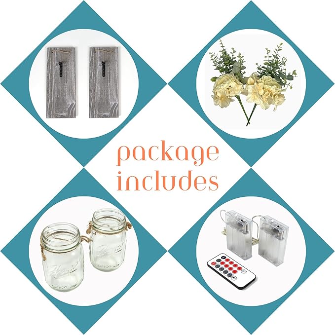 - Farmhouse Wall Sconces Set of Two – Each set includes includes 2 wall sconces, 2 mason jars, 2 artificial Rose & Eucalyptus flowers, 2 LED fairy lights, and 1 mini remote.