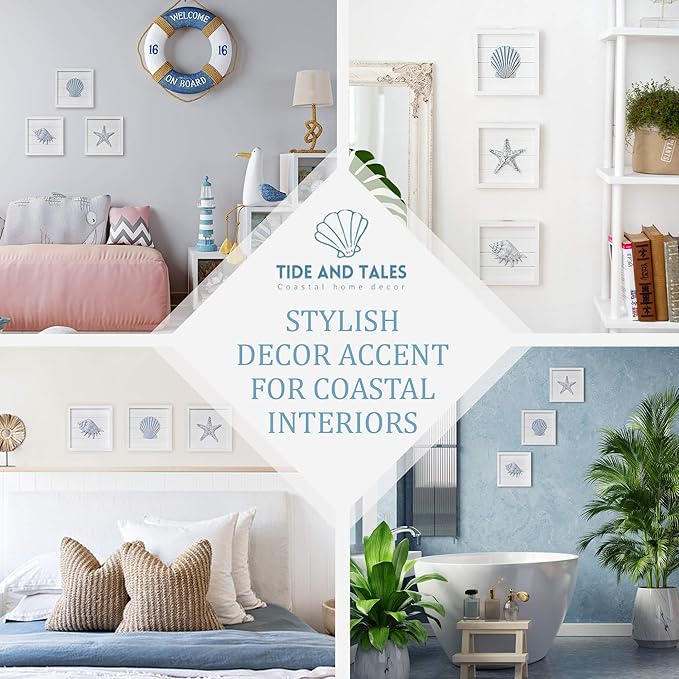 - Framed and Ready to Display - Each decoration features an elegant white 7” x 7”wooden frame so all you have to do is decide where you want to display this coastal wall art. The sawtooth hanger is attached at the back, and 3 hanging screws with anchors are also included.