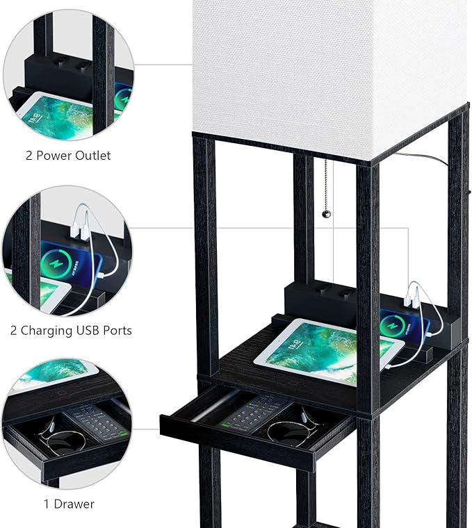 - 【2 Charging USB Ports & 2 Power Outlet】The modern floor lamp with drawer has 2 -charging USB ports and 2 power outlet, which can charge 4 devices like cell phone, tablet or bluetooth speaker in the same time.This will reduce the confusion of charging cables in the living room, bedroom and office, and improve the convenience of life and work.