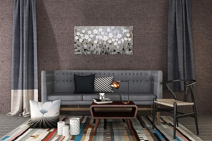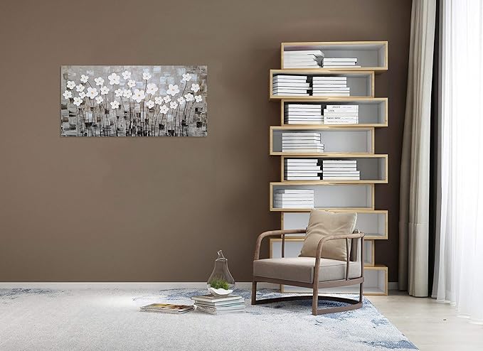 Yihui Arts Flower Canvas Wall Art Hand Painted Large 3D Grey and White Painting Modern Abstract Aesthetic Pictures Artwork for Living Room Bedroom Kithchen Decoration