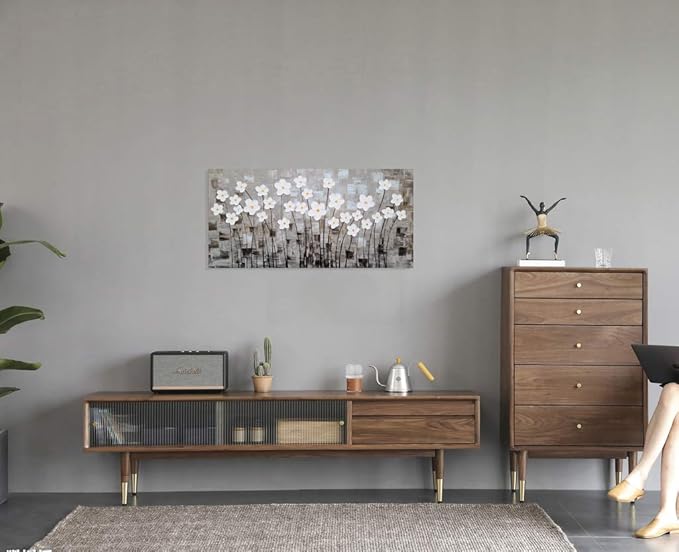Yihui Arts Flower Canvas Wall Art Hand Painted Large 3D Grey and White Paintings Modern Abstract Aesthetic Pictures Artwork for Living Room Bedroom Kithchen Decoration