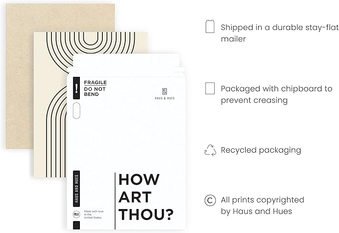 - SKILLFULLY CRAFTED: Haus and Hues minimalist wall art and boho prints are designed by our talented team of artists and made using the best art materials possible, so we can deliver an art print you will be proud to hang on your walls; All minimalist art prints are reinforced with chipboard pads and shipped in rigid Stayflat mailers to ensure that your print arrives in perfect condition; Our art prints arrive unframed, so you can choose the best frame or hanging option that will match your decor