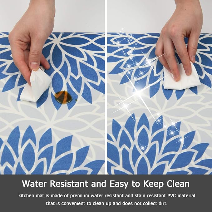 - Waterproof, Stain-Resistant & Easy Clean: Made from waterproof, oil-resistant, and durable high-density PVC material, our anti fatigue mats for kitchen floor resists spills, stains,dirt and pet hair, making it easy to wipe clean and maintain for a spotless kitchen look, just wipe it down with a wet cloth or hand-held vacuum