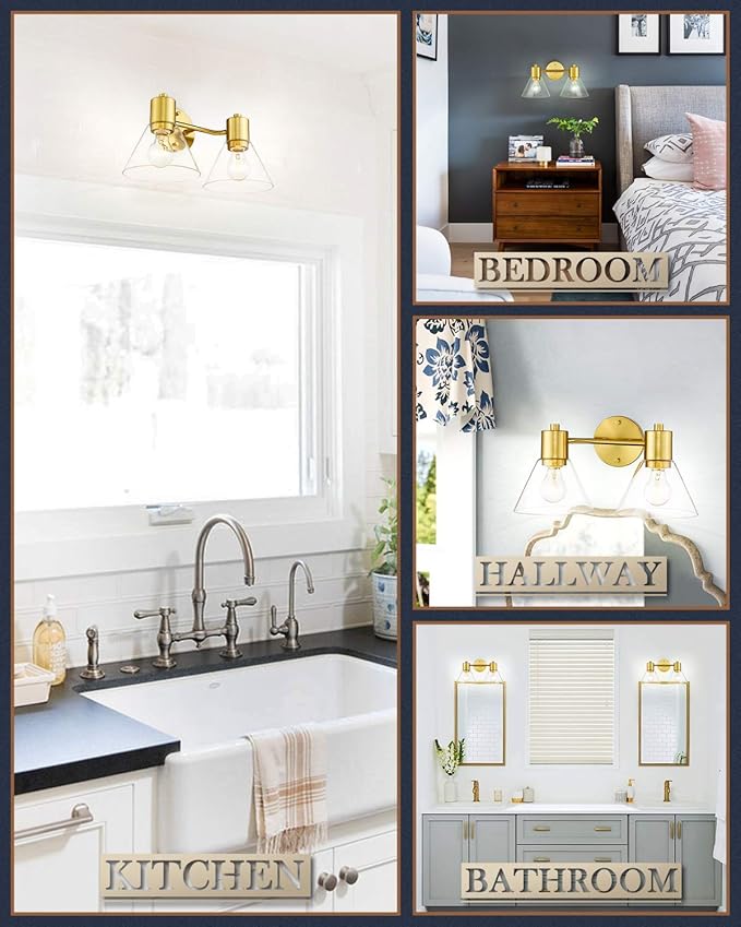 - GOLD BATHROOM WALL SCONCE: Crafted from a slim metal mount and circular backplate, this Gold bathroom wall lights features streamlined holders with clear glass cone shades that lend it a sleek, modern look.