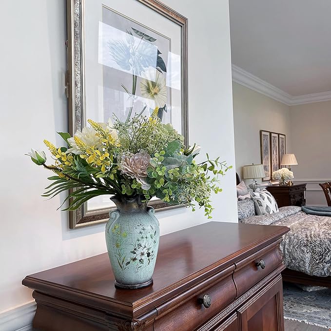 - FRESHLY PICKED CHARM FOR YOUR HOME - Imagine stepping into your garden at golden hour and picking a bouquet of your favorite blooms: eucalyptus, calla lilies, dahlias, lavender. All freshly gathered and bursting with life. That’s exactly the feeling this handcrafted artificial flower arrangement is designed to recreate. With vibrant colors, natural variation in shape and species, and a carefully curated mix of flowers and greenery, this piece brings effortless elegance to your home. No maintenance required. Whether placed in your living room, kitchen, or bathroom, it adds a soft, lifelike touch that brightens any space.