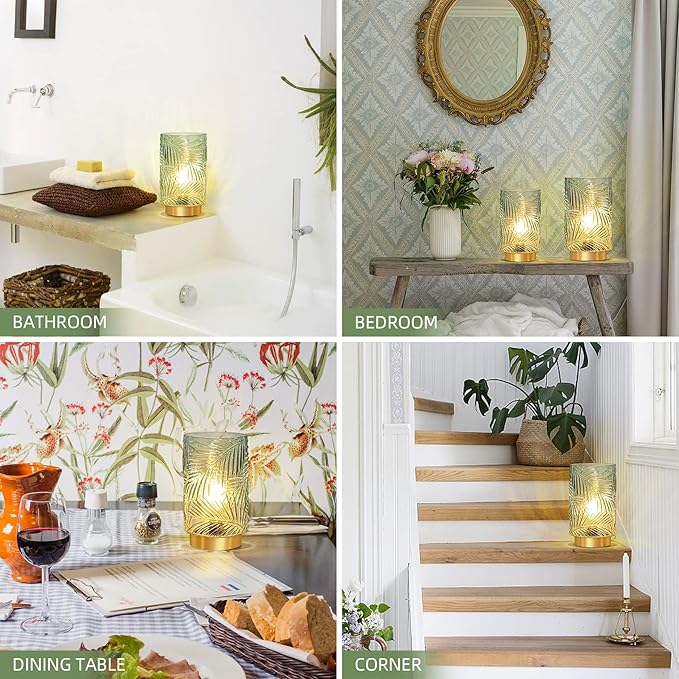 - Decorative Ambient Lamp And Emergency Lamp: Leaves pattern is a big hit nowadays. Our designer combine glass with leaf vein on the surface, with golden metal base to make this beautiful modern table lamp. Available in 2 sizes and each 3 colors in a glossy finish for your option. What’s more, it can be used as an emergency light during bad weather or power outages.Very suitable for areas without sockets, such as tabletop / corner shelf / entryway / stairway / bathroom