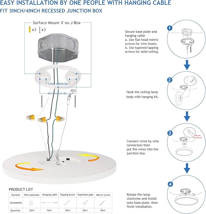 - Easy Installation With Hanging Cable: Our 12 inch dimmable ceiling light flush mount comes with a hanging cable and all mounting hardware to help install it within 5 minutes. Even one person can install it quickly