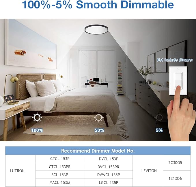 - Smooth Dimming 5%-100%: This led low profile black flush mount ceiling light uses American advanced dimming chips without flicker and buzz