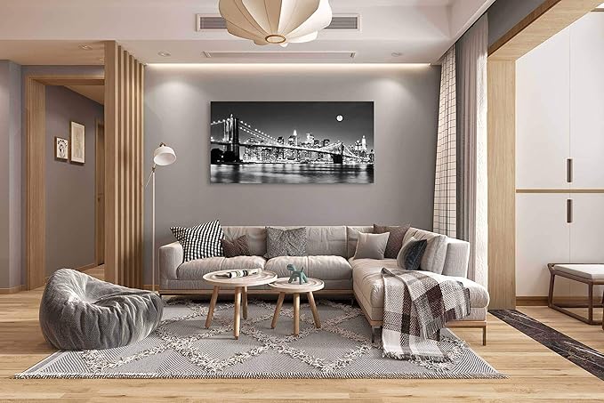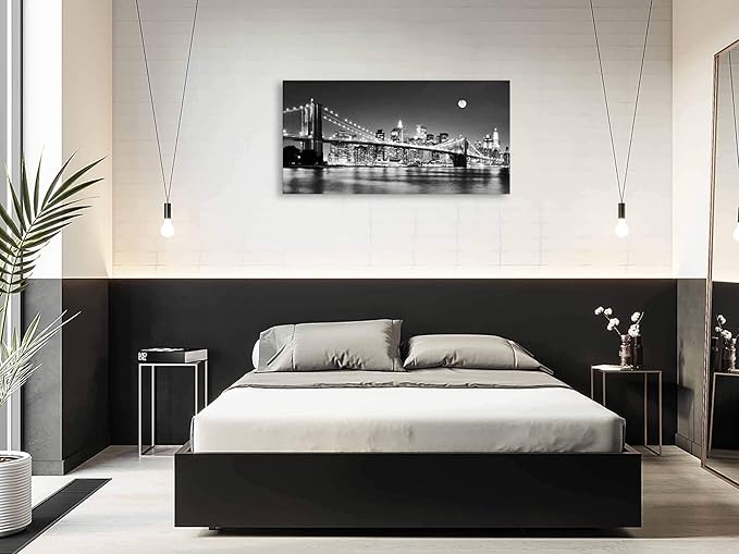 Baisuart-Q30350 Brooklyn Bridge Night View 1 Panels Landscape Artwork Canvas Prints Moon Night New York City Scene Picture Paintings Black and white Wall Art for Oiffce Home Decorations Wall Decor