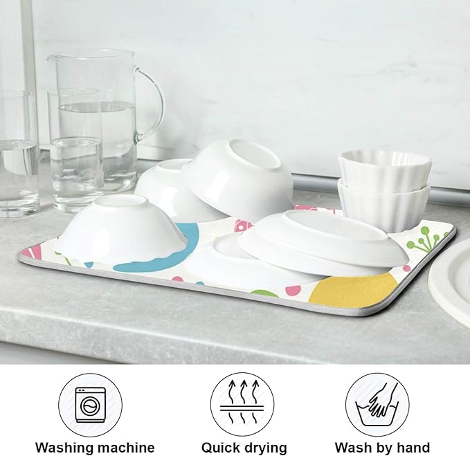 - Material: The printed surface of the kitchen tableware drying mat is made of high-quality polyester.The middle layer of the kitchen drying pad is composite sponge, which can quickly absorb moisture and keep the kitchen table dry and tidy.