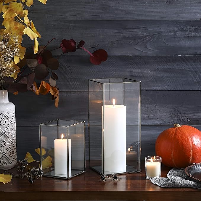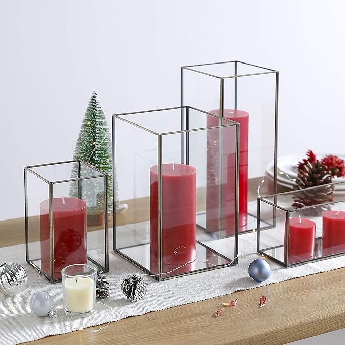 Set of 3 Square Glass Hurricane Candle Holders, Clear Glass Framed in Vintage Brass, Pefect for Spa, Hotel, Festival, Home Decoration,(Bronze Fram Finsh)