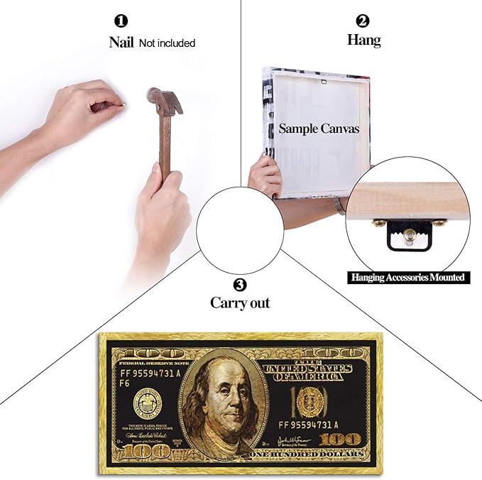 Large Size Motivational Framed Wall Pictures 100 Golden Dollar Money Artwork Posters Prints Culture Style Street Art Inspirational Canvas Painting Wall Art for Kids Room Studio Ready to Hang-48"Wx24"H