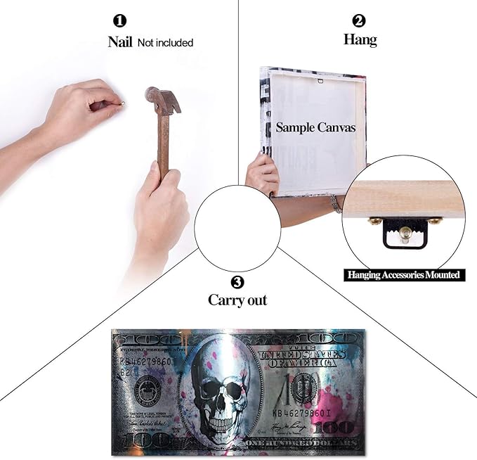 Yatsen Bridge Retro Skull Dollar Bill Canvas Art Print, 48" W x 24" H, Framed, Green, Black, Wood Frame, Waterproof, Landscape, Glossy Finish, Perfect for Living Room, Bedroom, Kitchen, Office, Bar