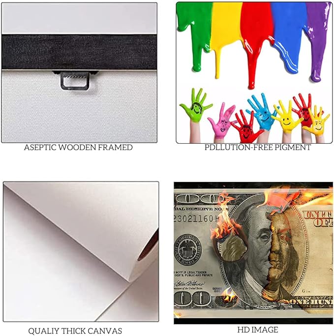Abstract Creative Dollar Wall Art Burning 100 Bill Money Office Artwork Wall Decor HD Print Flame Dollar Work Art for Study Room Classroom Library Wall Decor Frame and Stretched Easy to Hang-40"Wx20"H