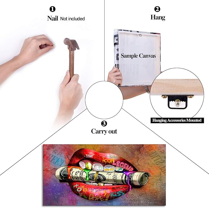 Large Size Canvas Sexy Red Lips with Rolled Dollar Wall Art Abstract Creative Modern Home Decor Artwork for Home Walls Large Prints Inspirational Framed Posters Gift Choice for Men and Women-48"Wx24"H