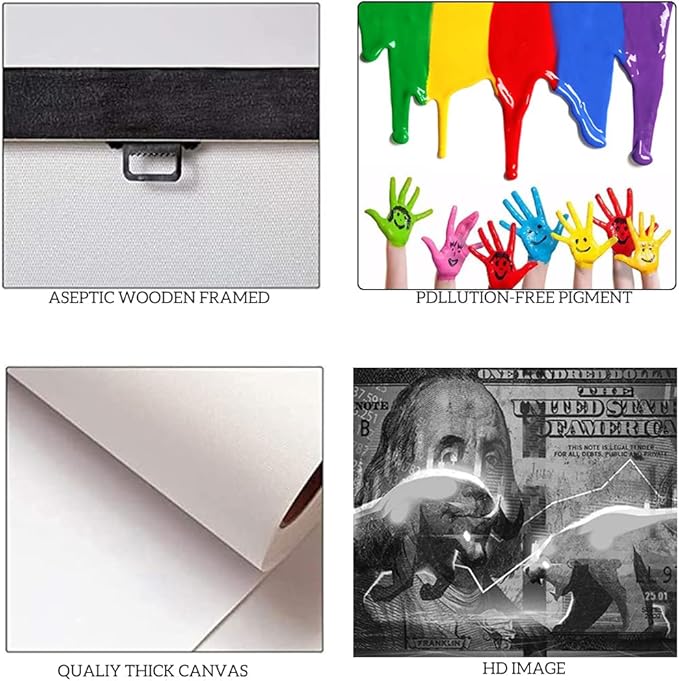 Wall Street Charging Bull Bear Canvas Paintings 100 Dollar Bill Money Poster Wall Art Picture Office Wooden Framed Easy and Ready to Hang-32 inch x 16 inch
