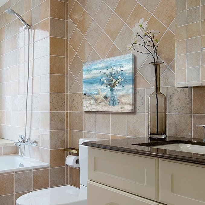 - Serene Beach Canvas Art:This blue wall art bring a touch of the beach's beauty into your home.The calming ocean canvas print showcases starfish resting on beach along with a drifting bottle,seashell,beautiful daisy floral bloom in a vase.This eye-catching seascape wall art make it an ideal decorating choice for a variety of spaces
