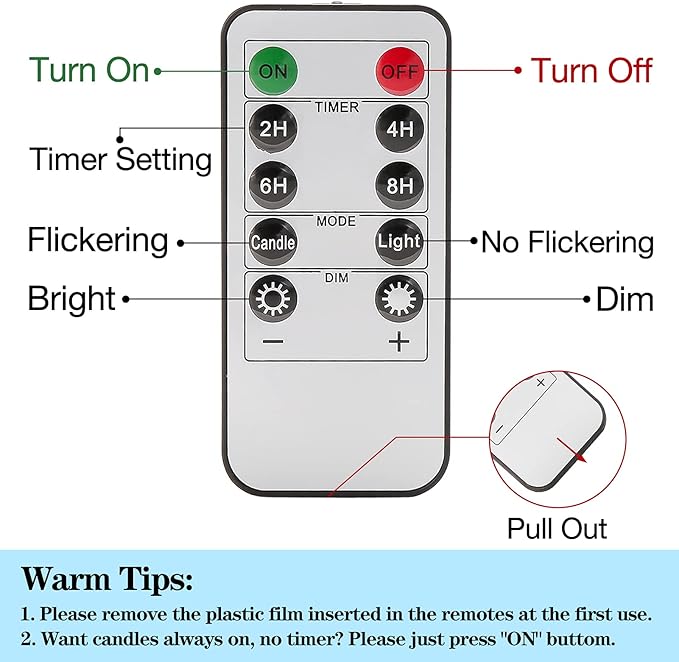 - Convenient Remote & Timer Function - Remote controller allows you to turn candles on or off, set 2/4/6/8 hours timer, set flickering or static flame effect, adjust brightness within 20 feet.