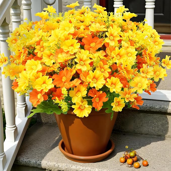 Uieke Artificial Fake Flowers, 6 Bundles Daisy Mums Flowers Outdoor UV Resistant No Fade Greenery Shrubs Plants Indoor Outside Hanging Planter Home Wedding DIY Garden Porch Décor (Orange Yellow)
