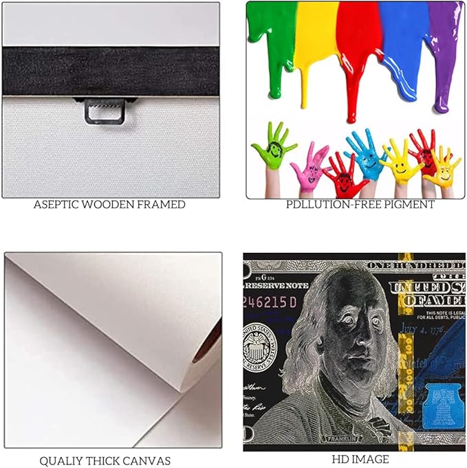 Abstract Creative 100 Dollar Bill Print Abstract Benjamin Franjlin Money Artwork Cash Art Print Rich Money Millionaire Canvas Paintings for Living Room Bedroom Wall Decor Framed Easy to Hang-32"Wx16"H