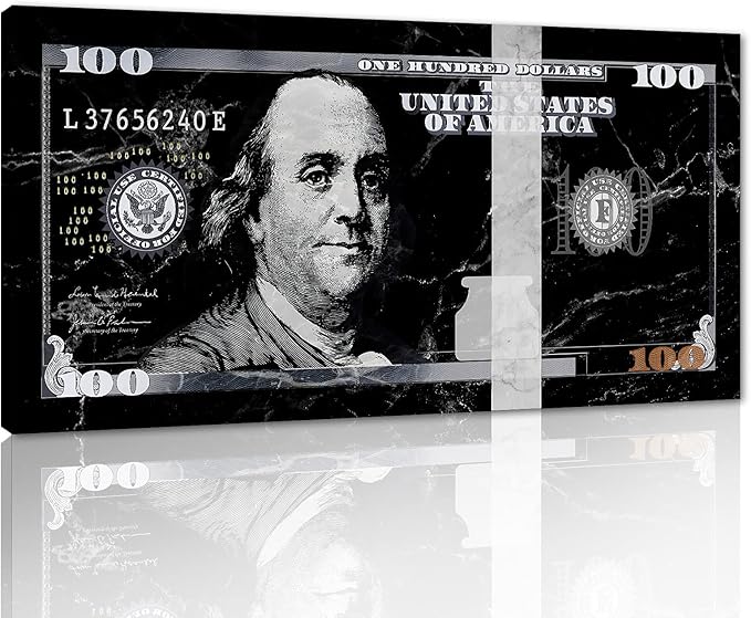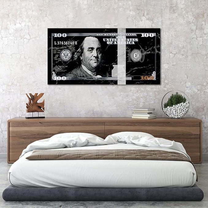 Extra Large Size Benjamin Franklin 100 Dollar Wall Art for Large Home Office Wall Decorations Inspirational Gifts for Men Black and White 100 USD Money Artwork Gallery Wrapped Easy to Hang-48"Wx24"H