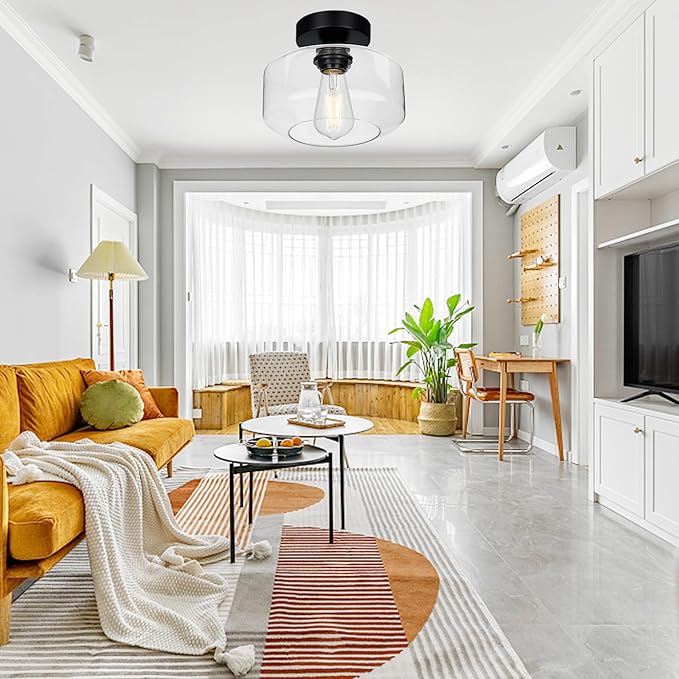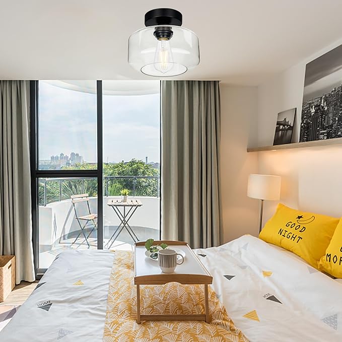 - Semi Flush mount Design& Classic Style--- This ceiling light is perfect for your Industrial /Modern look! A Matte Black Base and impurity-free hand-blown clear glass with excellent light transmittance offer a modern interpretation of a classic urban-industrial, gives you just the perfect lighting whenever you need.