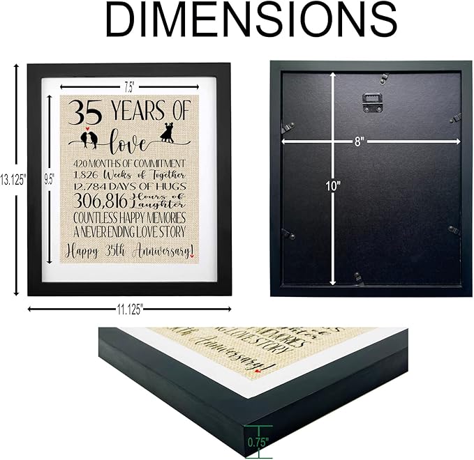 - Safe Materials Gifts for 35 Years of Marriage Anniversary: It’s an amazing anniversary party decoration. The burlap is a natural burlap fabric, Frame is manufactured from wood. The cover is plexiglass instead of glass, you won't worry about hurting the kids, and well-protective packaging lets you don't have to worry about receiving a damaged frame. Just feel free to express your love and send your warmth, Give them a surprise!