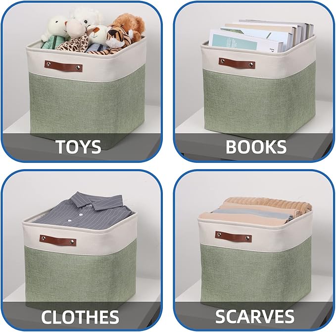 Temary Cube Storage Baskets for Shelves 4pack Fabric Storage Basket for Organizing Clothes, 13 Inch Storage Cubes with Leather Handles, Closet Baskets (White&Green)
