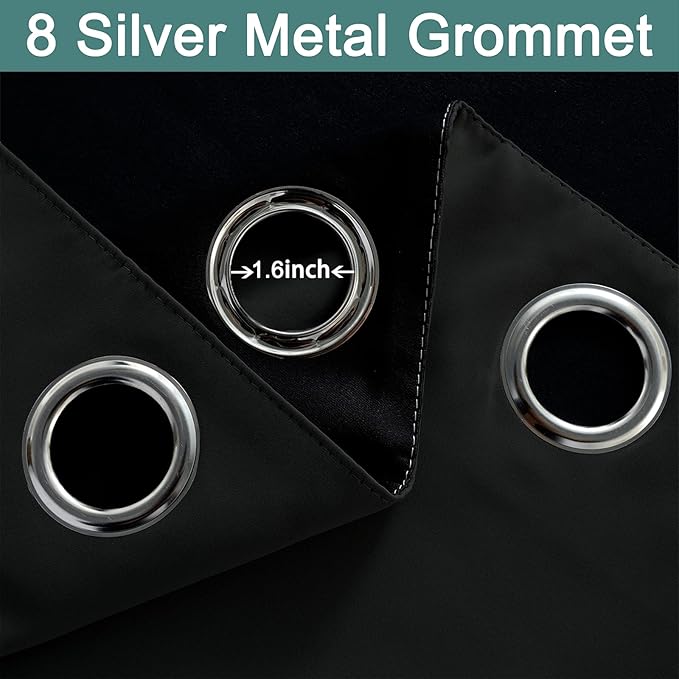 - PACKAGE MADE:2 panels per package. Each Lined Curtain measures 52" wide x 96" long. 8 Silvery Grommets per panel. This silvery grommet (1.6 inch inner diameter) fits many rods. Easy to hang and smooth to slide. The simple design gives people a sense of ease.