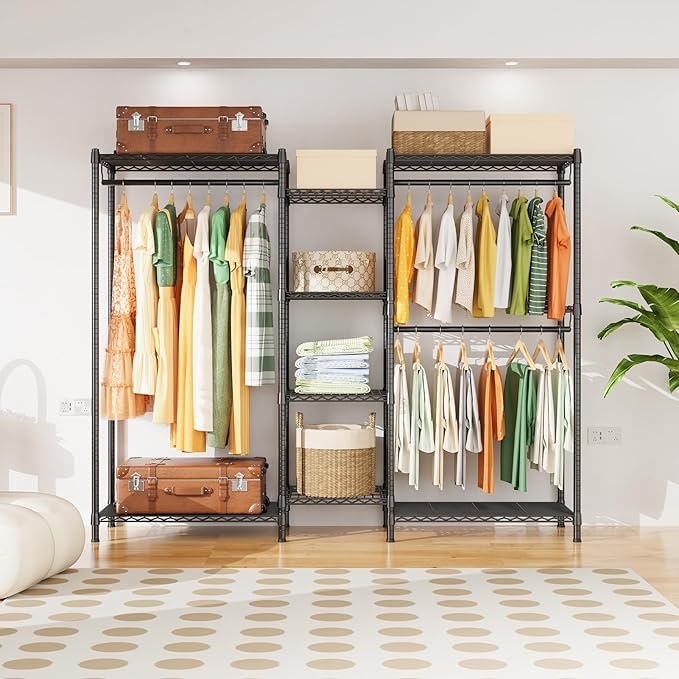 - Maximum Load Capacity: Constructed from Heavy-duty black-coated steel with three hanging rods, each wire shelf holds 110LBS for a total weight capacity of 800 lbs (evenly distributed). The hanging rod can hold up to 80LBS.