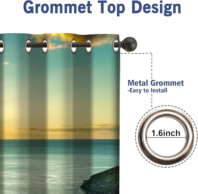 Jekeno Ocean Beach Blackout Curtains Ocean Morning Sunrise Decor for Bedroom Living Room with Hawaiian Seaside Scene Island Green Print Grommet Window Drapes 2 Panel Set, 52"x84"