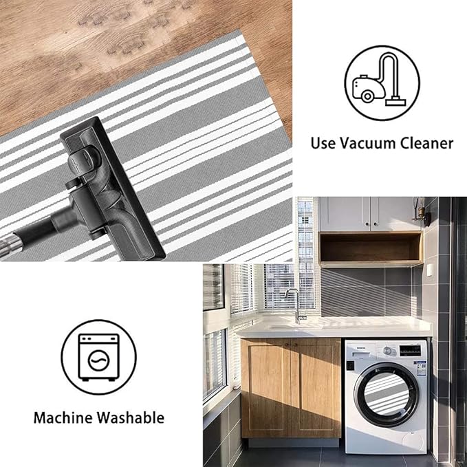 - Classic Stripe Design: This eye-catching gray and white striped rug will give your home the casual elegance. Put it on your front porch with a welcome doormat on top. Very cute layering! The latest and most trendy farmhouse decor!