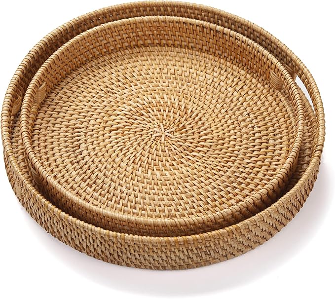 Rattan Round Serving Tray, Hand Woven Serving Basket with Cut - Out Handles, Wicker Fruit/Bread Serving Basket (11.8 + 13.8 inch)