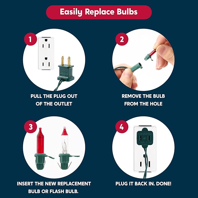 - Independent Bulb Operation & Spares Included.Features independently wired bulbs—if a light burns out, the rest stay lit! The set Come with 4 extra bulbs & 2 replacement fuses for easy replacement, ensuring your display stays bright throughout the season.