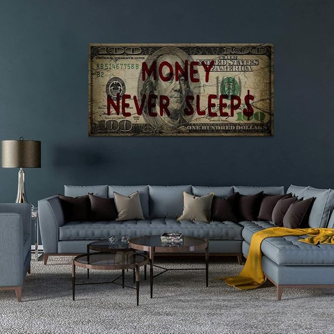 Canvas Money Wall Art Money Never Sleeps Inspirational Dollar Artwork Poster Canvas Painting Framed Ready to Hang-48x24 inches
