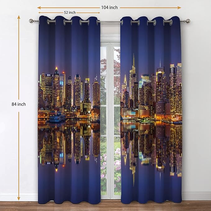 Jekeno City Landscape Blackout Curtains New York Manhattan Midnight Cityscape Ocean Reflection by The Coast Scenery Urban Decor for Bedroom Living Room Grommet Window Drapes 2 Panel Set, 52"x84"
