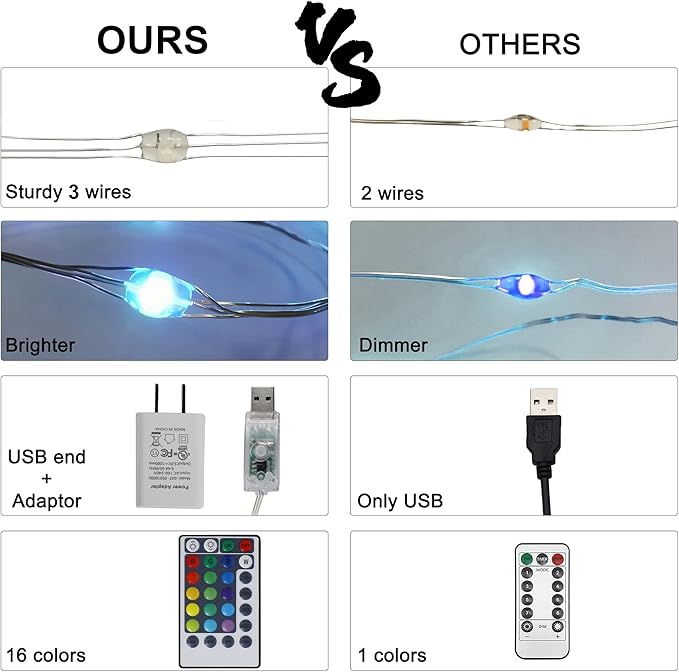 - Waterproof & Safety: The wire parts of the string lights are fully sealed, thus making it submersible, but the USB and adapter are NOT waterproof, so please keep them away from water. With low voltage no overheat after many hours of usage, safe to touch after any hours of usage.