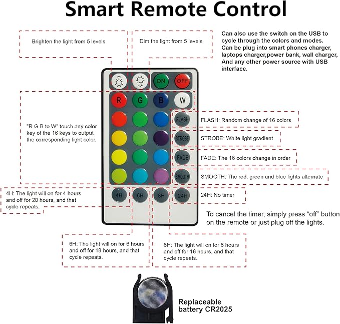 - Remote Control & Timer: The remote effective range can reach to 10ft at the longest distance. Turn on/off the lights through the remote, set them in timer to auto on and off each day, adjust the brightness. And you can also adjust the lighting mode by pressing a button on the USB. With 16 different RGB colors, 4 different modes, and 4 kinds of timer(4H: 4 hours ON, 20 hours OFF; 6H: 6 hours ON, 18 hours OFF; 8H: 8 hours ON, 16 hours OFF; 24H: no Timer).