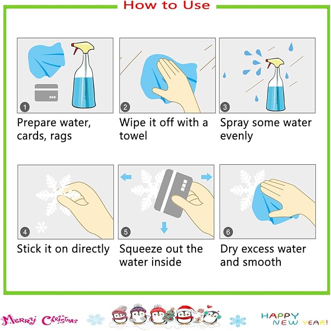 - Easy to use xmas window clings: Holiday window clings for glass windows can be used without glue. spray the area to be posted with water before use, then apply christmas stickers for windows, finally dry and wipe it flat without leaving any marks.