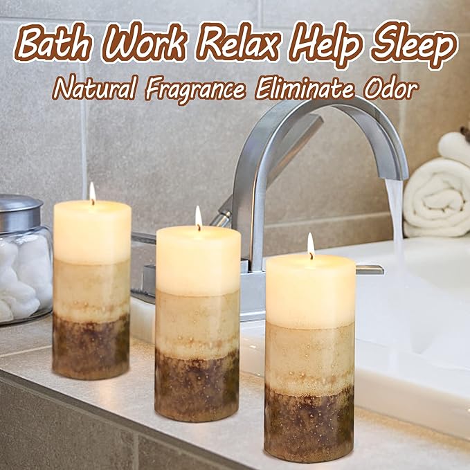 - Wax Ingredients - Mottled 3-layered ivory and brown pillar candles are made of natural wax and 5% plant essential oils.The wick is 100% lead-free cotton, which will not produce black smoke when ignited