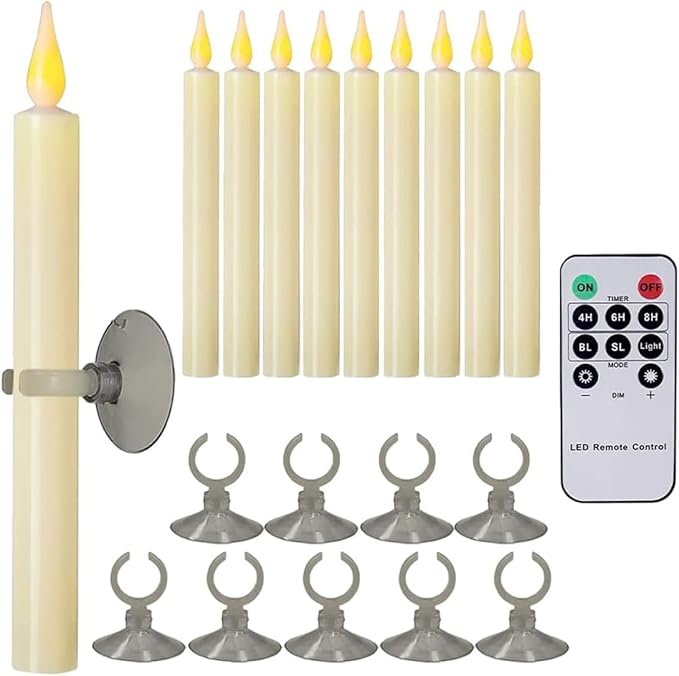 - Flameless Taper Candles: This pack comes with 9 flickering flameless taper candles, 9 suction cup, 9 plastic buckle, 9 metal sticker, 1 remote control and 1 user manual. this set includes nine flickering flameless taper candles(8.26 inch high x 0.78 inch diameter). Each candle operated by 3 AAA batteries(not include).