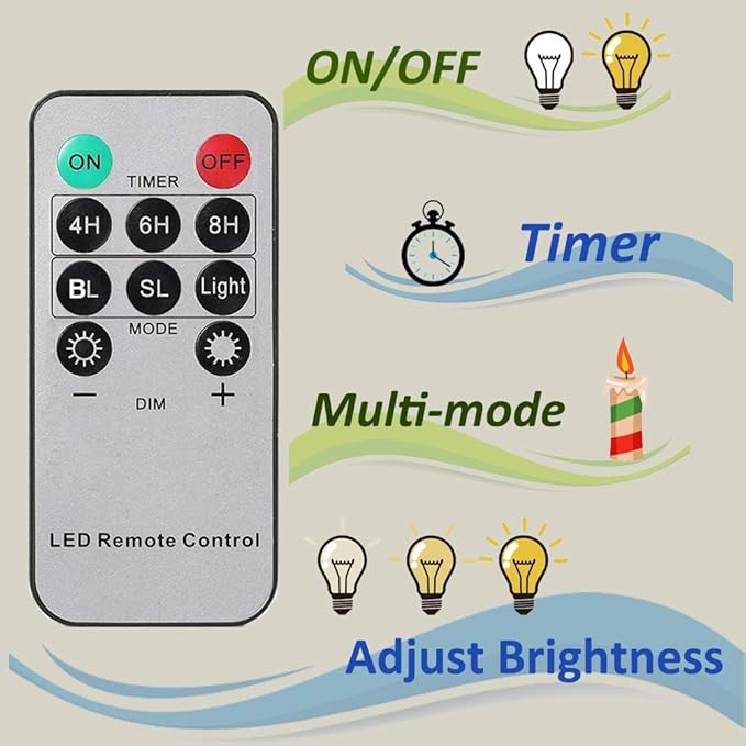- Remote & Timer: You will receive a 10-key remote control to all candles. You can set your candle on a 4/6/8 hour timer, adjust brightness, change flicker mode. Create the warmest lighting effect through the remote to make it brighter or softer depending on the mood you looking for.