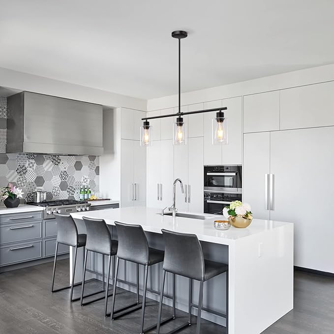 Kitchen Island Lighting, 3 Lights Linear Chandeliers Rectangle Pendant Light Fixtures for Dining Room Farmhouse Hanging Light with Glass Shades(Black)