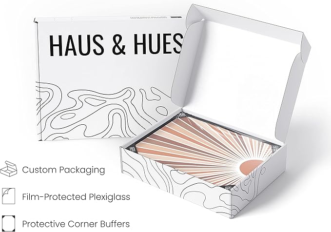 - PREMIUM QUALITY: To achieve the quality we’re known for, we use a giclée printing technique on 270 GSM solar white linen paper. The paper we use for sun wall decor is sourced in the US, and our inks are water-based and toxic-free. Our Pennsylvania oak frame adds the finishing touch to the bohemian decor. It’s equipped with plexiglass covered by protective film and two metal hangers for horizontal or vertical hanging. Sunrise picture is shipped in a durable box for protection while in transit.